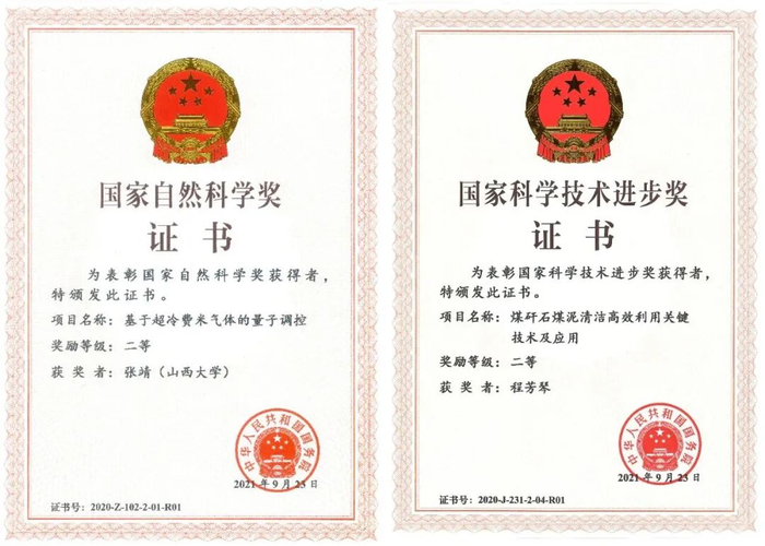 2021年11月3日,北京人民大会堂,国家科学技术奖励大会隆重召开。山西大学张靖教授领衔的“基于超冷费米气体的量子调控”项目荣获国家自然科学奖二等奖;程芳琴教授领衔的“煤矸石煤泥清洁高效利用关键技术及应用”项目荣获国家科学技术进步奖二等奖。