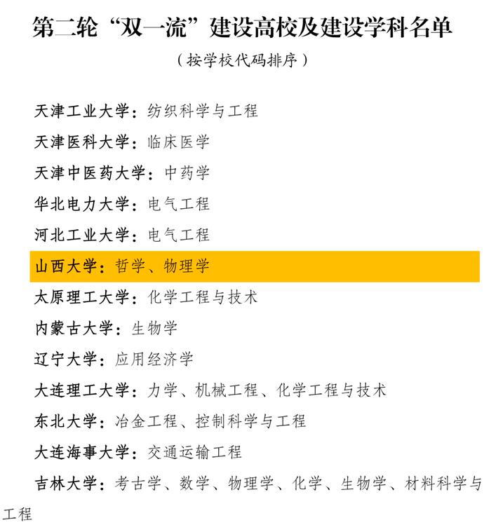 2022年2月14日,教育部、财政部、国家发展改革委正式公布《第二轮“双一流”建设高校及建设学科名单》,山西大学入选“双一流”建设高校,哲学、物理学两个学科入选“双一流”建设学科。