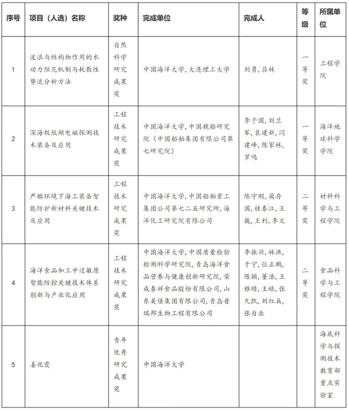 学校获奖项目(人选)分别为:工程学院刘勇教授主持完成的成果“波浪与结构物作用的水动力阻尼机制与耗散性势流分析方法”获自然科学研究成果奖一等奖,海洋地球科学学院李予国教授主持完成的成果“深海极低频电磁探测技术装备及应用”获工程技术研究成果奖一等奖,材料科学与工程学院陈守刚教授主持完成的成果“严酷环境下海工装备智能防护新材料关键技术及应用”、食品科学与工程学院李振兴教授主持完成的成果“海洋食品加工中过敏原智能防控关键技术体系创新与产业化应用”分别获工程技术研究成果奖二等奖。海底科学与探测技术教育部重点实验室姜兆霞教授荣获青年优秀研究成果奖,是学校第2位获此殊荣的青年教师。