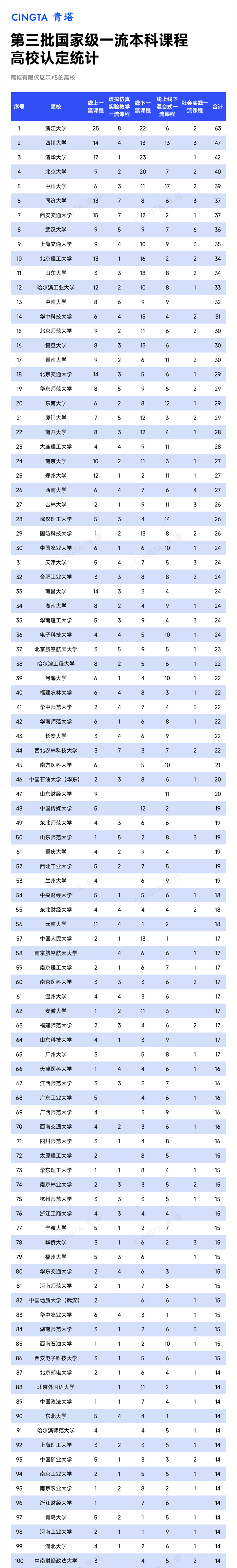 据青塔统计,第三批国家级一流本科课程认定中,浙江大学获批63门,四川大学获批47门,清华大学获批42门,北京大学获批40门。中山大学、同济大学、西安交通大学、武汉大学、上海交通大学、北京理工大学、山东大学、哈尔滨工业大学、中南大学、华中科技大学、北京师范大学、复旦大学、暨南大学获批课程数在30门及以上。