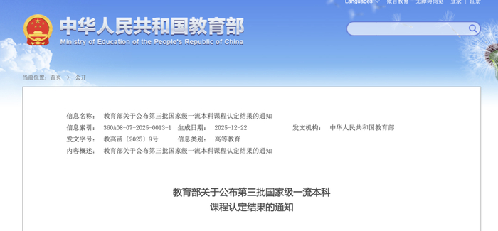 近日,教育部发布《关于公布第三批国家级一流本科课程认定结果的通知》,根据《教育部关于一流本科课程建设的实施意见》(教高〔2019〕8号)和《教育部办公厅关于开展第三批国家级一流本科课程认定工作的通知》(教高厅函〔2023〕24号)有关要求,经省级教育行政部门、有关部门(单位)教育司(局)、中央军委训练管理部军事教育局、部属高等学校申报推荐,并经专家评议与公示,认定5994门课程为第三批国家级一流本科课程。其中,线上课程1000门,虚拟仿真实验教学课程500门,线下课程1841门,线上线下混合式课程2204门,社会实践课程449门。