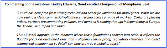 Memphasys董事局非执行主席Lindley Edwards表示,CE标志获批标志着Felix迈入规模化和商业化发展的新阶段。