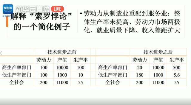 技术进步之后,假设应用了数字技术等新科技,去改造高生产率部门,使它的生产率更高。从这个意义上说,没有“生产率悖论”,因为任何一个企业花钱应用新技术,是为了获得生产率的提高,否则是不会投资的。因此假设高生产率的部门产值没变,劳动力减少了80%,那么生产率提高了4倍,变成了500。那么低生产率的部门,它没有应用新技术,还是生产原来那么多产值,但是它必须接受更多的劳动力。因为我们假设了这个经济社会只有两个部门,因此从一个部门被排挤出来的劳动力,必然要进入另一个部门。因此它的劳动力增加了80%,生产率降到了5.6,那么全社会的劳动生产率还是55,没有提高。但是发生了一个重要的结构性变化,部门之间劳动生产率的差距更大了,部门之间相应的工资差异也就更大了,我们把它叫做劳动力市场两极化。