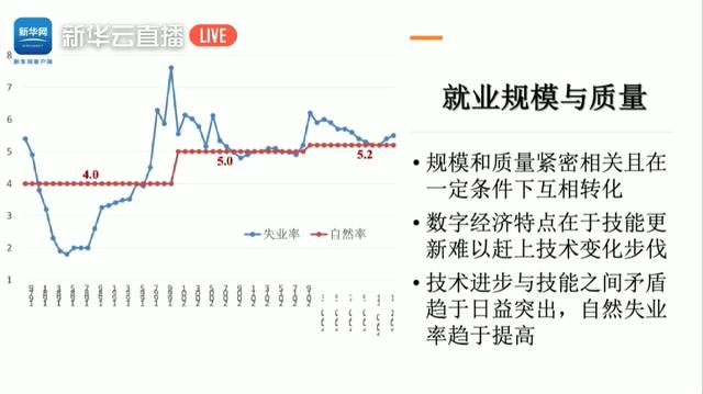 在过去这些年自然失业率是有所提高的,这意味着虽然劳动力短缺现象始终比较严重,企业还都在抱怨说找不到工人,但是工人实际上也有就业困难,这些困难以结构性困难为主,就是说虽然企业有岗位,但是我的技能、人力资本和岗位不匹配,所以我不能进入到岗位。因此我们国家自然失业率的提高也证明了,在数字经济发展过程中,必然要提高劳动力市场的匹配性,所以当我们讲在数字经济条件下劳动力市场转型的时候,其实最重要的是如何让劳动者的技能、人力资本和数字经济发展的需要相匹配。