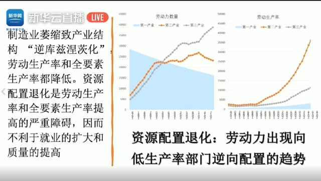 那么减少的这些人去哪了?大多数情况下他们不会回到农业中。农业的劳动生产率太低了,报酬也低。因此多数情况下,他们到了第三产业,去了生产率相对较低的生活服务业中。那么我们看左右两个图灰色的这条线,第三产业的劳动力是增长较快的,但这也产生新的矛盾,劳动力的内卷化就发生了。更多的人集中在生产率更低的部门,可能造成生产率进一步下降。虽然岗位还在,但是破坏掉的岗位比新创造的岗位的质量还高,新创造的岗位比破坏掉的岗位的生产率还低,这个不是我们数字经济发展的初衷。