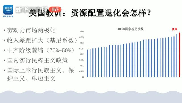 劳动力市场两极化会带来:第一,收入差距拉大;第二,中等收入群体减少,这种现象在我国还没有明显出现,但是在美国已经得到充分验证。美国社会现在收入差距很大,原因就在于美国科技进步很快,一些部门在应用新技术提高生产率之后,被排挤掉的劳动力只好退到生产率更低的服务业中,这部分人收入提高很慢。因此造成社会两极分化,收入差距扩大,中等收入群体萎缩。当经济处于两极情况下,人们的价值观就变成了对立的,因此社会分化、政治分裂也就是必然的,造成了美国今天的状况。如果没有解决办法,在国内就只好实行民粹主义政策,而民粹主义政策最终在国际上就反映为民族主义、单边主义、贸易保护主义等,最终促使了逆全球化进程,以上是以美国为例总结的一些教训。