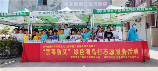 2017年底,海南职业技术学院和海南省学校毒品预防教育协会联合成立了海南职业技术学院禁毒志愿服务队,主要任务是组织学生志愿者和禁毒宣传大使在节假日深入吸毒率比较高的乡村和社区开展“禁毒防艾绿色海岛行”志愿服务活动。该项目融合政府的政策与财力资源、高校的人力资源和社会组织的专家资源,探索“政、社、校”的“三位一体”的禁毒防艾宣传教育模式,实现了资源整合,成果共享,确保了项目的可持续发展,成为了海南禁毒三年大会毒品预防教育工作的品牌。“禁毒防艾绿色海岛行”已经覆盖全省12个市县和14所高校,完成了100站的中期目标,直接服务对象达5万余人,间接受益人群达20余万人次。