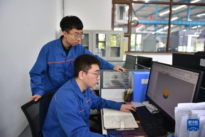 加强校企合作 实现高质量就业---5月12日,在沈阳睿昇精密制造有限公司,一名已和企业签约的沈阳工学院机械工程与自动化学院毕业生(下)在企业车间办公室设计零部件。