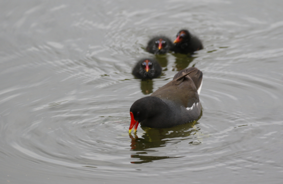 鸳鸯和鸭子一起争抢食物 作者拍摄在水里游泳的水鸟可能是鸭,但也可能是“鸡”。有一种全身乌黑,唯独嘴上有点红的水鸟,它名叫“黑水鸡”,它既不是鸭子,也跟我们最常吃的鸡没啥关系。它在城市水域也是常客,但常被人叫成了鸭子。与鸭子不同的是,黑水鸡的脚趾间没有蹼,所以它们在水上游起来有些费劲,因此相较于游泳,它们更喜欢在水岸上踱步。