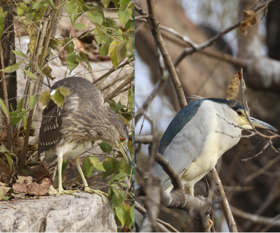 夜鹭对比图 作者拍摄和绝大多数鹭类不同的是,夜鹭晚上才出来捕食,因此白天我们能看到成群夜鹭在水边扎堆睡觉,很难看到它们飞行捕食的场面。