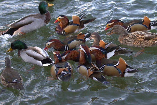 绿头鸭 作者拍摄而在一些城市中,鸳鸯也成了常见的鸟类,鸳鸯跟鸭子一样也属于鸭科。它们本是迁徙鸟类,但如今不少鸳鸯习性改变在城里定居下来,这是因为经常能得到游客的投喂,加上城里的食物也确实充足。于是,它们成了城市公园中一道风景。当然,这里还是要提醒大家,不要投喂这些野生鸟类,否则可能影响它们的健康。