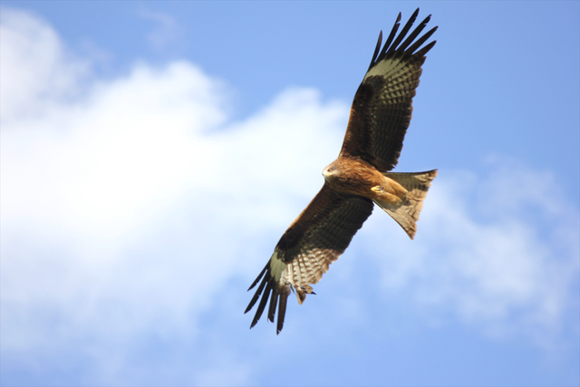 城市里常见的猛禽有普通鵟(kuáng)和黑鸢,我们往往能看到它们盘旋时的样子,区分它们只要看看它们翅膀下的颜色。黑鸢的翅膀朝下的羽毛是深色的,而普通鵟颜色更加浅白。