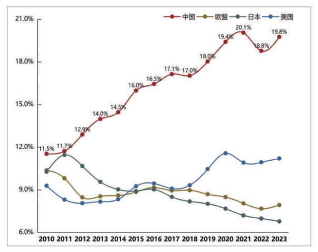 数据来源: 中国海关总署中国-东盟货物贸易额占东盟外贸总额比重已从2010年中国-东盟自贸区成立之初的11.5%上升至2023年接近20%的水平,高于东盟与其他主要贸易伙伴的贸易规模占比(图2)。