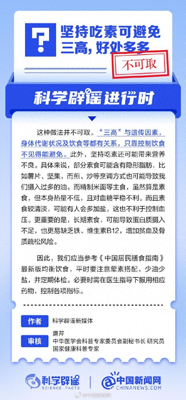 “三高”与遗传因素,身体代谢状况及饮食等都有关系,只靠控制饮食不见得能避免。此外,坚持吃素还可能带来营养不良。长期素食,可能导致蛋白质摄入不足,也更易缺乏铁、维生素B12,增加贫血及骨质疏松风险。(来源:@科学辟谣 @中国新闻网)