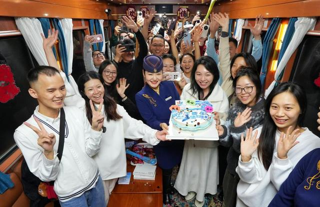 “中国雪都·我的阿勒泰”号旅客列车的工作人员与旅客举办跨年活动。新华社发
