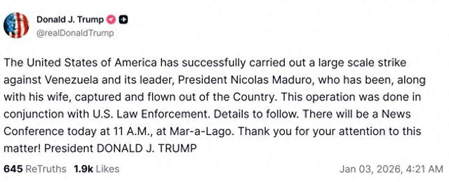 美国东部时间3日凌晨4:21左右:特朗普在社交媒体发文称,美方已成功对委内瑞拉实施打击,抓获马杜罗及其夫人,并带离委内瑞拉。