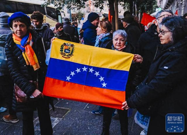 1月3日,在意大利那不勒斯,当地民众手持委内瑞拉国旗参加抗议活动。新华社发