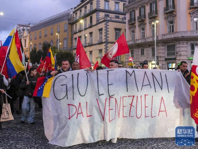 1月3日,在意大利那不勒斯,当地民众手持写有反对干涉委内瑞拉内容的标语参加抗议活动。新华社发