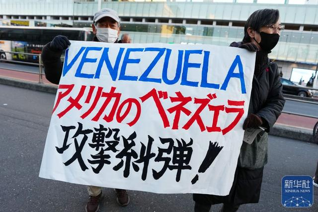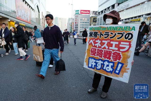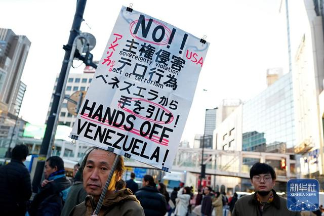 1月4日,在日本东京新宿站前,日本民众参加抗议活动,谴责美军突袭委内瑞拉。新华社记者 贾浩成 摄