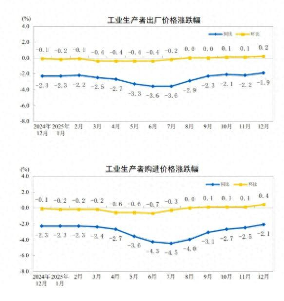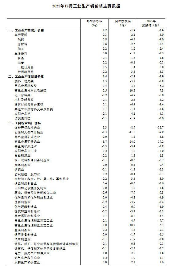 2025年12月份,全国工业生产者出厂价格同比下降1.9%,降幅比上月收窄0.3个百分点;环比上涨0.2%,涨幅比上月扩大0.1个百分点。工业生产者购进价格同比下降2.1%,降幅比上月收窄0.4个百分点;环比上涨0.4%,涨幅比上月扩大0.3个百分点。2025年全年,工业生产者出厂价格下降2.6%,工业生产者购进价格下降3.0%。