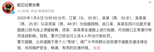 1月8日12时50分许,江某(女,30岁)、吴某(男,35岁)、吴某某(男,25岁)以及漆某(男,48岁)为拍摄视频,由江某、吴某在四川北路天潼路路口斑马线上滞留跳舞,漆某、吴某某在道路上进行拍摄,对该路口正常通行秩序造成影响。目前,警方已依法对上述4人作出行政处罚。