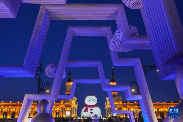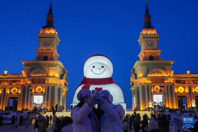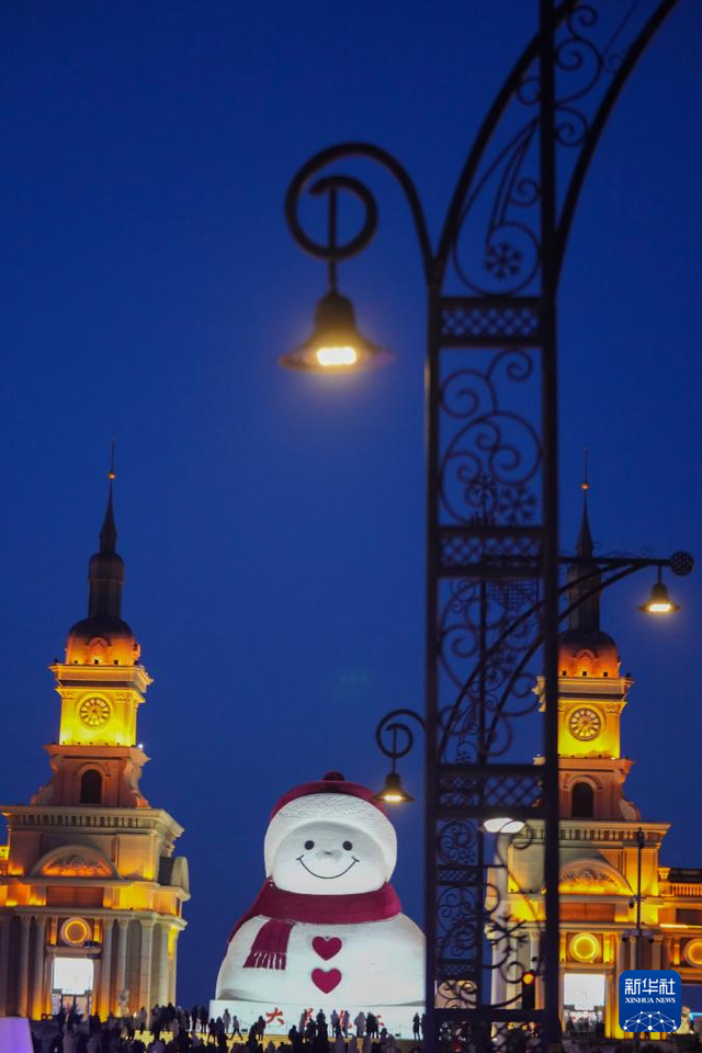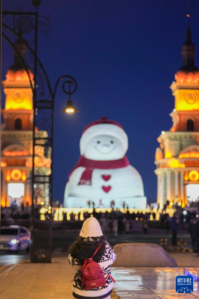 时下,“冰城”哈尔滨市正值冰雪旅游旺季。位于哈尔滨市群力音乐公园的大雪人吸引着众多游客前来打卡。日落后的蓝调时刻,在天光与灯光的交相映照下,大雪人更显浪漫迷人。
