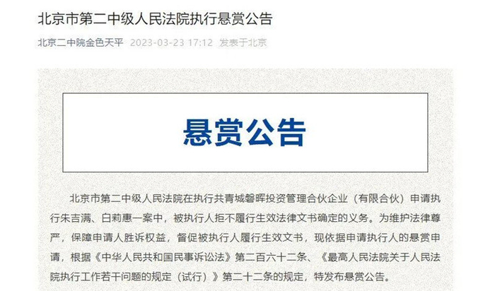 3月23日,北京市第二中级人民法院在执行共青城磐晖投资管理合伙企业(有限合伙)申请执行朱吉满、白莉惠一案中,被执行人拒不履行生效法律文书确定的义务。依据申请执行人的悬赏申请,该案件执行标的金额约为11.12亿元及迟延履行期间的债务利息。