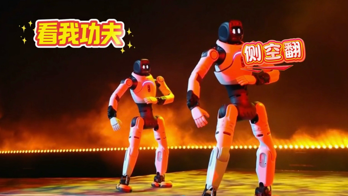 此外,智元机器人还和王鹤棣共同带来节目《闻机起武》,伴随着激昂的《男儿当自强》音乐,灵犀X2和王鹤棣炫酷登场,随后8台灵犀X2连续后空翻、前空翻、踢腿、侧空翻等高难度酷炫动作轮番上阵:凌厉的踢腿动作劲道十足,腿部关节发力精准,尽显力量感;侧空翻时躯体旋转角度丝毫不差,与舞台灯光交织出极具冲击力的视觉效果;前空翻衔接利落;随后精准完成连续后空翻,落地稳稳当当;气势如虹尽显机器人钢铁“真男儿”本色。