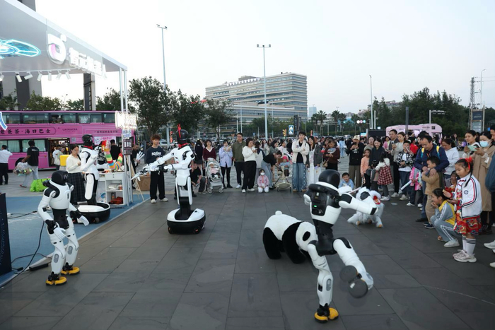 场外快闪店中,远征A2、灵犀X2能和进场的观众们互动问答,更是连连摆出可爱pose拍照;精灵G2则是带来了才艺——抖空竹,观众们可以亲身体验这一民间游艺活动,另一台精灵G2还随着音乐翩翩起舞,跳上了华尔兹。四足机器人D1的熊猫、醒狮造型憨态可掬,引得众人大呼“好萌”。除此之外,机器人们还很会“社交”,和候场的明星们频频互动逗趣儿,暖暖的很贴心。