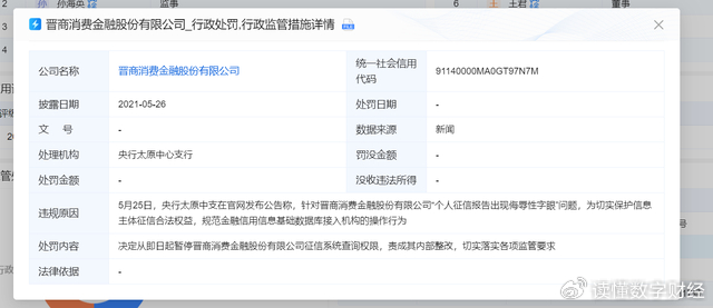 据报道,2021年晋商消费金融曾因征信报告上出现侮辱性字眼“专业做鸡十年”被中国人民银行太原支行约谈和处罚,于2021年5月25日展厅晋商消费金融征信系统查询权限,责成其内部整改,切实落实各项监管要求。