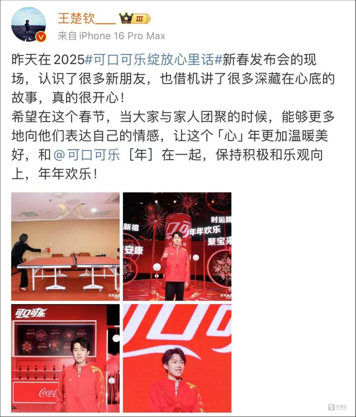 要知道,王楚钦在结束16日的中国乒乓球超级联赛后,立即赶往了可口可乐2025年新春发布会的活动现场,且活动当日还强忍身体不适。这几天,乒坛的流量几乎有一半都聚焦在王楚钦身上。许多王楚钦的球迷也是因他而前往发布会现场或守在屏幕前。