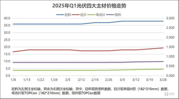 整个一季度,根据InfoLink的统计数据,如果不考虑跨年周,从1月8日开始计算,直到3月末,取主流产品价格进行测算,长期低位横盘的硅料价格涨了5.56%,硅片大涨16%,电池片大涨21.43%,跌了两年的组件也上涨7.25%。