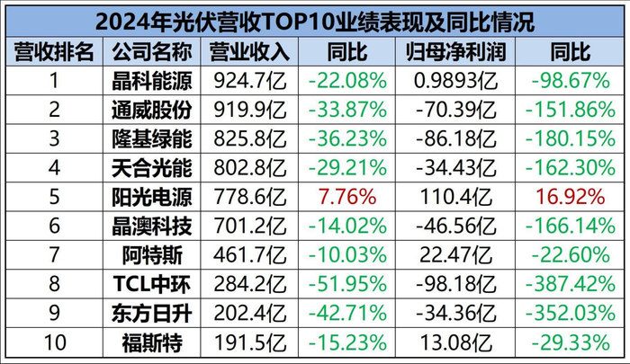 2024年,光伏TOP10合计亏223亿