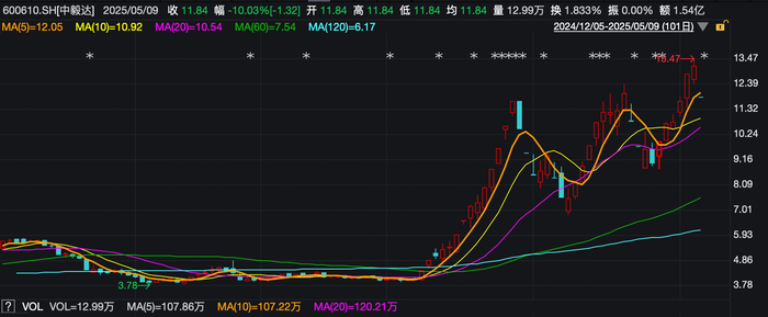 5月9日,“妖股”中毅达(600610.SH)终结近期的第三轮暴涨,“一字板”跌停开盘,之后一直趴于板上。截至收盘,报11.84元/股,跌10.03%,并有超43万手卖单在“卖一”堆积。