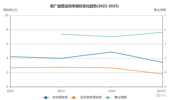应收账款管理方面,公司通过客户结构优化和信用管理强化实现了周转效率的改善。Wind数据显示,新广益前五大客户销售收入占比从2022年的69.64%降至2024年的52.88%,两年间下降16.76个百分点,客户结构持续优化。