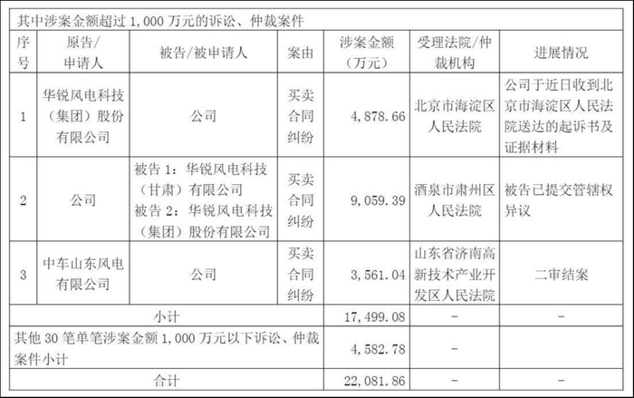 2025年10月,九鼎新材以买卖合同纠纷为由,向酒泉市肃州区人民法院递交诉状,要求华锐风电支付9059.39万元。在此之前,华锐风电已以交付违约为由,向北京市海淀区人民法院起诉九鼎新材,索要因逾期交货造成的违约金、经济损失合计4878.66万元。