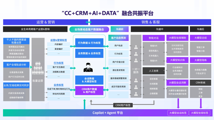 这种范式革命的背后,是容联云通过深度融合自身通讯底座与数据能力,构建出的“AI+CC+CRM+Data”融合共振平台。在这种深度融合下,原本脱节的营销、销售与服务环节打破了职能壁垒,转变为动态互联的有机整体: