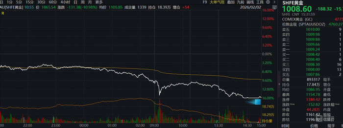 2日午后,黄金、白银价格继续深度下探。现货黄金跌破4500美元/盎司,日内下跌7.5%。现货白银跌幅一度超14%,抹平近一个月涨幅。国内商品期市午盘大面积收跌,沪银、钯、铂跌停,沪金跌11.68%;基本金属全部下跌,沪锡跌停;能源品、黑色系、化工品纷纷跟跌。