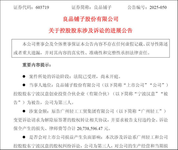2025年10月,良品铺子公告,易主武汉国资一事告吹。同年12月,广州轻工二次变更诉讼请求,要求解除原签署的股权转让相关协议,并支付违约金及保全费等诉讼费用合计约2074万元。