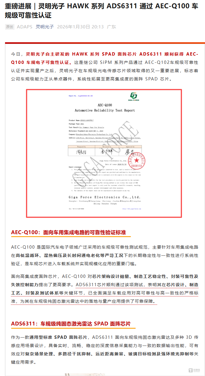 更关键的是,公司的商业化已迈出实质性步伐。就在智洋创新公告收购前三天,灵明光子公众号高调宣布,其自主研发的HAWK系列SPAD面阵芯片ADS6311成功通过AEC-Q100车规认证。这一认证是芯片进入汽车前装市场的“通行证”,意义重大。
