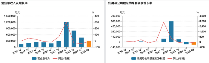可以对比的是低成本的盐湖股份,即便在周期底部,其业绩下滑幅度明显小于盛新锂能,且始终能实现盈利。2023年、2024年,其营收分别是215.79亿元、151.34亿元,同比下降29.80%、29.86%;归母净利润79.14亿元、46.63亿元,同比变动-49.17%、-41.07%。