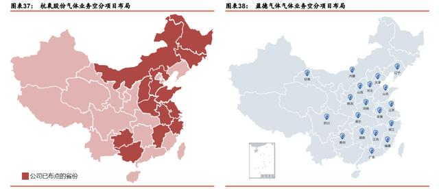 经过十余年的发展,本土企业已在国内建立了跨区域多省份的空分项目广阔布局。其中既包括依托空分设备技术实力转型第三方气体运营服务的杭氧股份,也包括较早进入气体市场的专业气体服务公司盈德气体。从第三方制气的装机量占比看,本土龙头杭氧股份、盈德气体在本土市场也已初具规模。据杭氧股份、陕鼓动力公司公告及盈德气体官网公告披露的截止 2018 年的合计客户现场装机量,中国市场总体装机量约为 700 万立方米/小时,其中盈德气体、杭氧股份和陕鼓动力分别占比为 33%、20%和 5%。我们认为,从国内市场装机量占比来看,目前本土龙头企业杭氧股份和盈德气体已初步具备大公司的资源调配和快速扩张的能力。