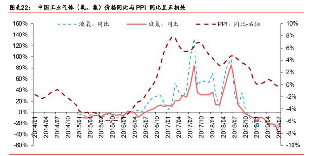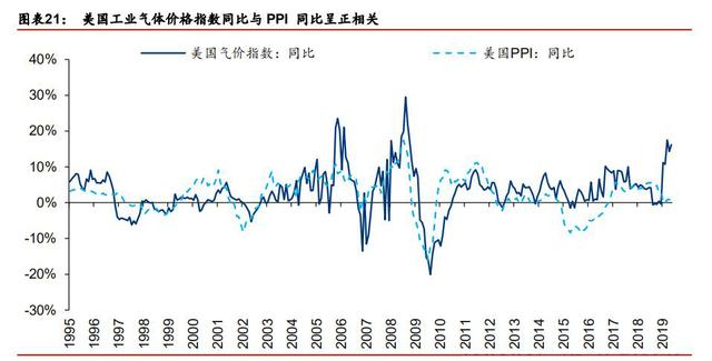 零售市场气价同比增速与 PPI 同比增速显著正相关。们将 1995 年至 2019 年 5 月的美国工业气体价格指数同比增速与美国 PPI 同比增速进行回归,回归结果显示气价指数增速与PPI 增速呈正相关关系,P-value在经济周期上行阶段,需求端消费增加,带动气价上扬,工业气体业务有望享受经济上行周期带来的量价弹性。
