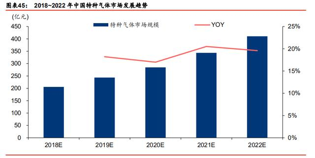 受益于集成电路、面板、光伏等下游产业的高速发展,中国正成为全球特种气体需求的增长点。目前国内电子特气的主要应用终端为集成电路、显示面板、LED 照明及光伏电池等领域,其市场需求与下游产业的发展具有较高的关联度。根据卓创资讯统计,2010~2017年中国特种气体市场销售额平均增速达 15.48%,2017 年中国的特种气体市场规模达到约178 亿元,预计 2018~2022 年仍将以平均超过 15%的年增长率高速增长,到 2022 年中国特种气体市场规模将达到 411 亿元。