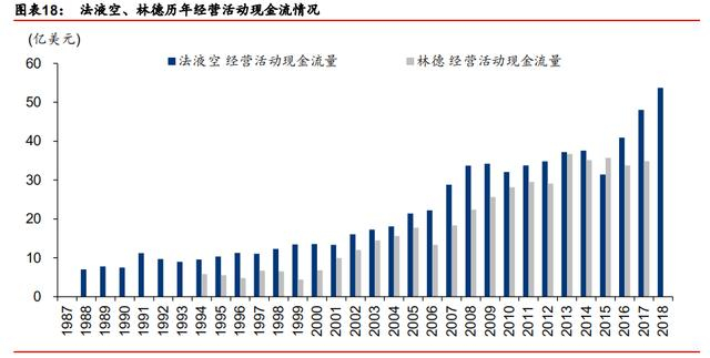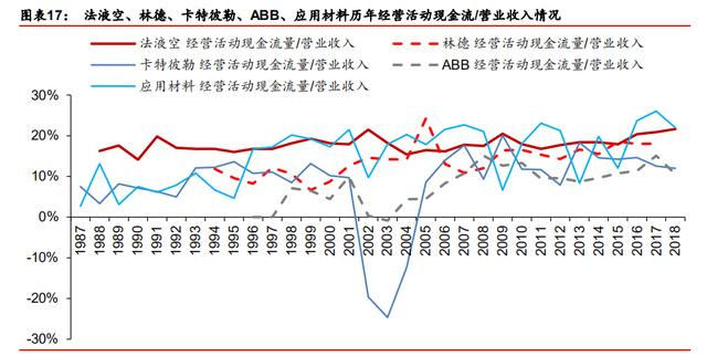 稳定持续的经营活动现金流为工业气体公司的中长期成长提供了坚实基础。装备制造业主要产品多为中游资本品,经营活动现金流受宏观经济及下游产业的经营状况影响较大,进而影响公司资本支出和中长期成长的可持续性。气体项目通常依托于一个或多个长期供气合同而设立,收入、利润、现金流具有良好的稳定性,在经济下行阶段仍能够保持较好的现金流状况,从而支撑公司气体项目的稳步扩张。得益于此,1987~2018 年法液空、林德的经营活动现金流/营业收入稳定性好于卡特彼勒、ABB、应用材料,现金流与资本开支形成良性循环后总体保持增长趋势,而三家装备制造龙头经营活动现金流则受经济周期影响较大。