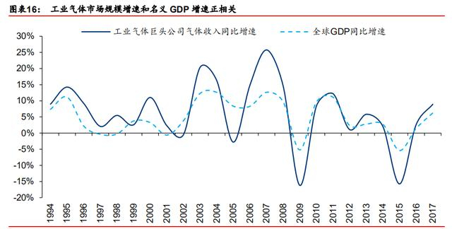 工业气体市场伴随经济发展在波动中不断扩张,市场规模增速和 GDP 增速是正相关关系。我们通过 1994-2017 年四大工业气体公司的气体收入总和的增速与世界 GDP 增速进行回归,P-value