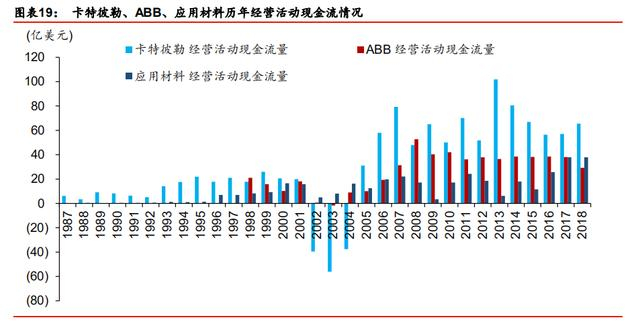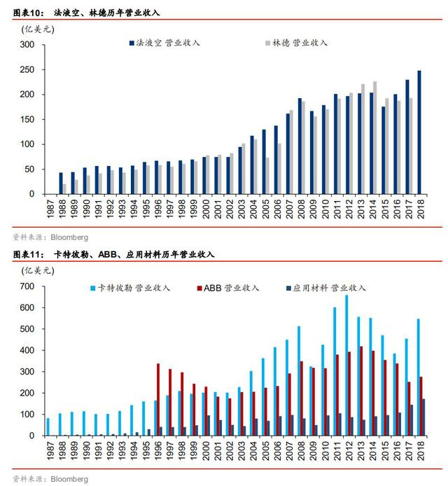 从收入角度来看,1987~2018 年法液空、林德的收入整体呈稳健增长趋势(部分年份出现下滑但未改变总体趋势),而卡特彼勒、ABB、应用材料则呈现较明显的周期性,且在经济下行阶段下滑幅度相对较大。