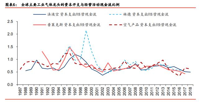 空分项目属于重资产业务,初期设备投资较高,企业资本开支支撑了气体项目的不断扩张,而气体项目扩张带来的经营活动现金流稳健增长同时又为未来持续的资本开支提供了必要保障。在国外空分设备企业普遍向工业气体运营转型的 20 世纪 90 年代,法液空、林德、普莱克斯、空气产品都曾在部分年份出现资本开支接近或超过经营活动现金流的情况,但随着 21 世纪以来气体项目的累计规模不断增加和气体收入占比的提升,上述公司的经营活动现金流稳健增长并足以覆盖公司进一步扩张所需的资本开支,气体业务的“现金牛”优势得以体现。我们认为,当气体公司的现金流形成上述良性循环,将有望进入“滚雪球”的发展模式,实现中长期可持续的稳步扩张。编辑