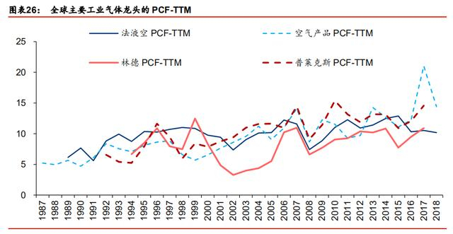 受益于特有商业模式所带来的长期稳健成长,市场长期给予海外工业气体巨头 20 倍左右的 PE 估值且保持相对稳定。我们结合法液空、林德、普莱克斯、空气产品四大工业气体公司 1987~2018 约三十年的估值数据进行比较发现,PE 估值的稳定性最高,PS、PB、PCF 则波动幅度较大。其中 1987~2018 年法液空、林德、普莱克斯、空气产品平均 PE(TTM)估值水平分别为 19.9、23.8、19.6、19.8 倍,波动范围分别为 14~24、11~63、14~54、14~27 倍。