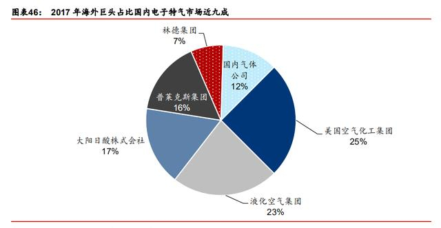 电子化学品的高竞争壁垒、(下游客户)高转换成本等特点,使得其供应体系高度稳定,且高端产品基本由欧美日企业垄断。在电子特气领域,林德、法液空、空气化工等海外工业气体龙头凭借自身技术及产品优势,占据了市场绝对主导地位,2017 年合计占比国内电子特气市场份额近 90%。